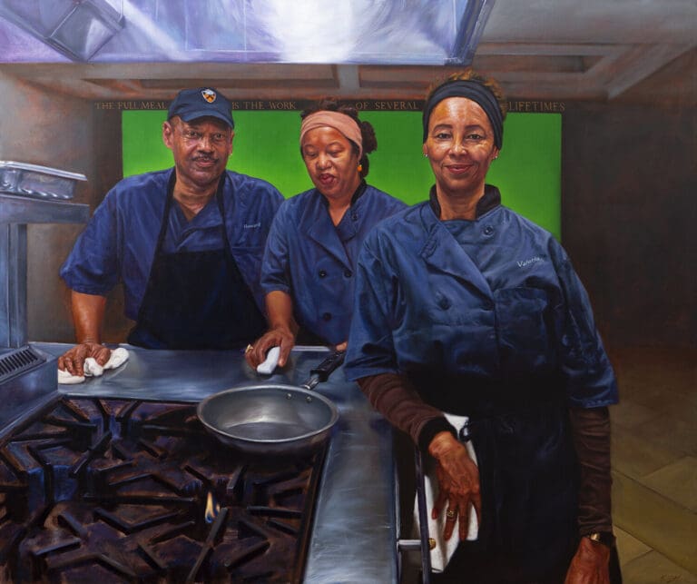 During 2018-19 academic year, while working at Princeton as a Hodder Fellow (granted to artists with “exceptional promise”), Moore took note of how most of the institutional portraits on display were of white men. He looked for the workers, mostly African American, that saw to the everyday needs of the university and painted a series of large-scale portraits.